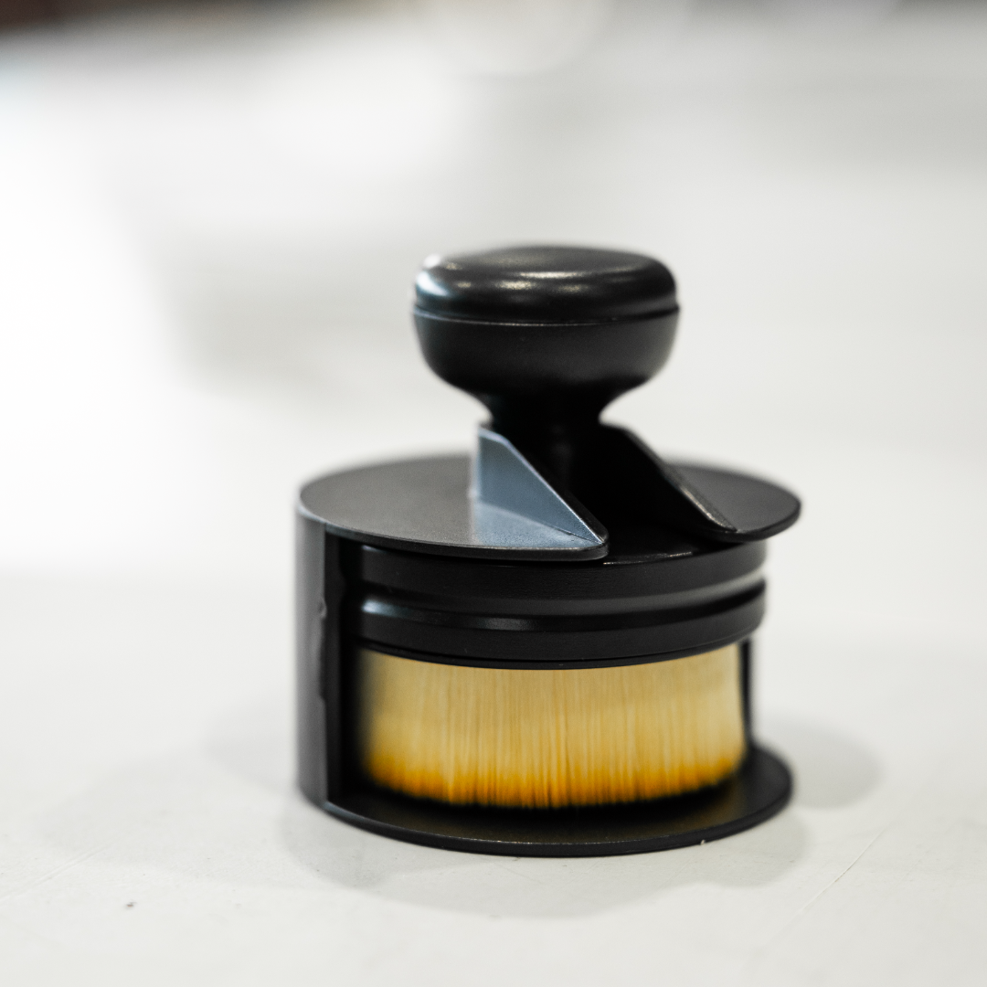 Pincel ergonómico para aplicação uniforme de brilhos e dressings em pneus.